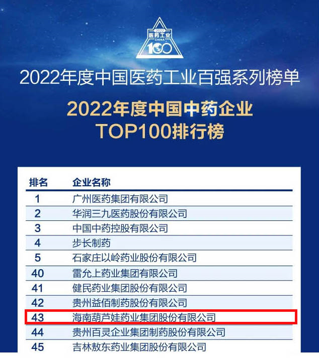 会议期间,一年一度的中国医药工业百强系列榜单隆重揭晓,CA88药业集团凭借领先的研发优势和扎实的生产实力以及稳健的市场推广能力,连续第四年成功入选“2022年度中国中药企业TOP100排行榜” ,排名稳步上升至第43位。